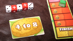 You play Math’d Potatoes by drawing a card, rolling five dice and making an expression that “satisfies” the card.