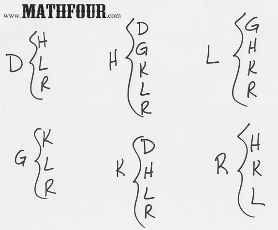 Here is the solution of who voted for whom. The initial of the person is on the left and the initial of the people for whom they voted is in the curly brackets. Click on the picture to enlarge.
