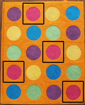 The pink dots form a line and then the one dot off to the side can make a perpendicular line to the other line. (Purple dots, too.)