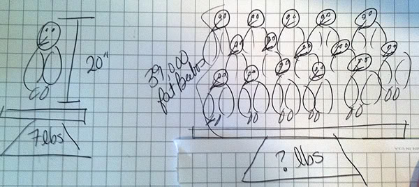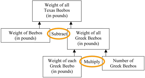 The flowchart for problem #2 starts with the final answer on the top (the weight in pounds of all Texas Beebos) and works its way down using the pieces necessary. The data below a box is what it takes to get the answer listed inside the box.