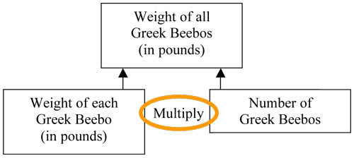 Notice that the What/How Much chart you would have done for this word problem will need to be flexible. It isn’t until you make this flowchart that you realize there is another piece of necessary information to calculate before you can calculate the final answer. It’s the “in between answer” for the weight of all Greek Beebo birds. You can stick it at the bottom of the chart with a note: