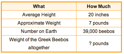 1. The Beebo bird lives in two places in the world. Some live in Texas and some live in Greece. Greek Beebos are about 20 inches high and weigh around seven pounds. There are about thirty-nine thousand Greek Beebos. How much do the Greek Beebos weigh altogether?